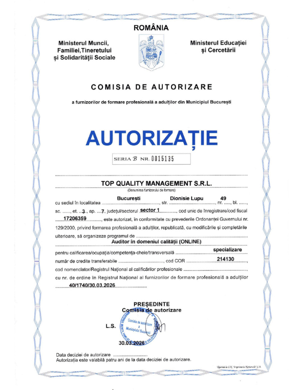 Vă mulțumim pentru interesul acordat cursurilor autorizate organizate de Top Quality Management și suntem nerăbdători să vă avem în rândul cursanților noștri. Descoperiți o lume a cunoașterii și a oportunităților alături de noi și începeți călătoria spre succesul personal și profesional!