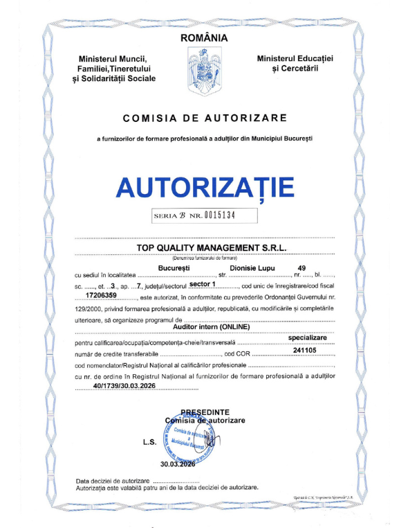 AUDITOR ÎN DOMENIUL CALITĂȚII, AUDITOR INTERN SISTEM DE MANAGEMENT INTEGRAT ISO 9001, ISO 14001, ISO 45001